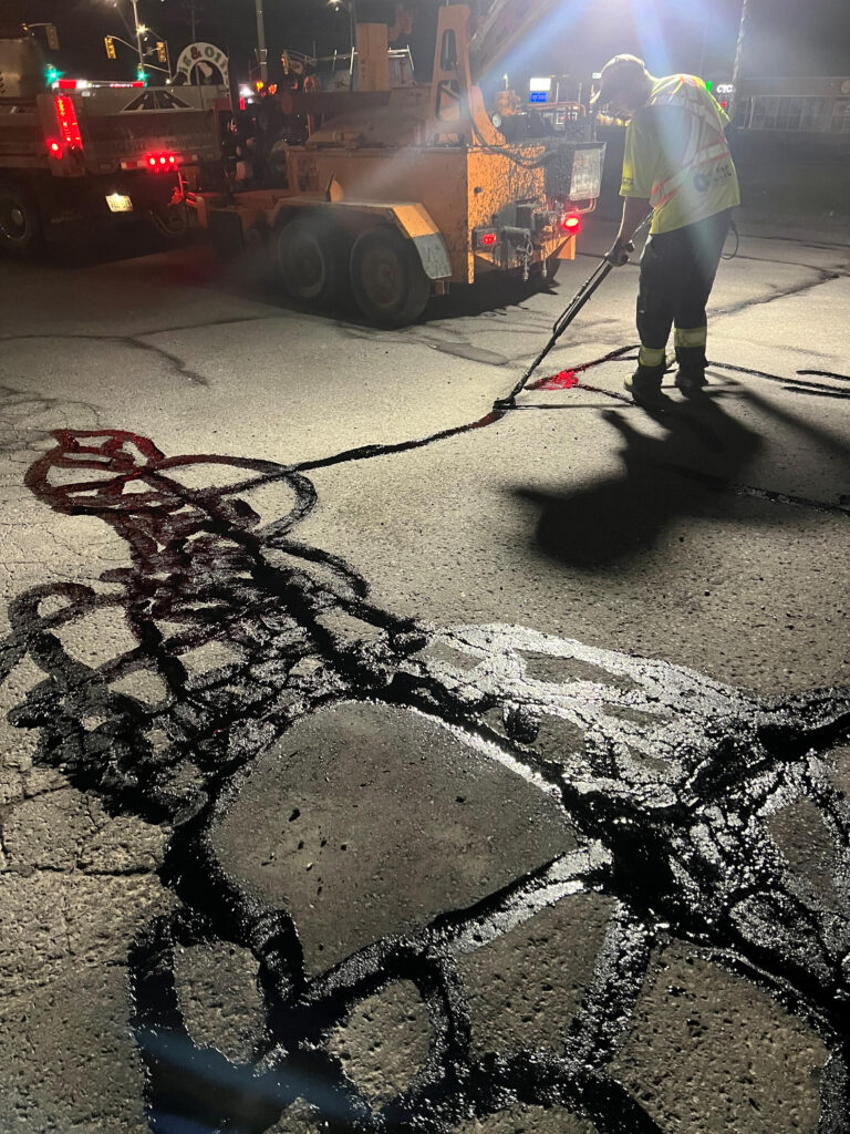Crack sealing, as the name suggests, seals in the cracks found on your asphalt surfaces by applying a hot melted rubber sealant using MTO-approved methods to prevent water seepage in the cracks. When the sealant cools down, it acts as a flexible adhesive to keep the cracks watertight; therefore, preventing chances of the paved surface from cracking open due to frost heaving during frigid winter temperatures.